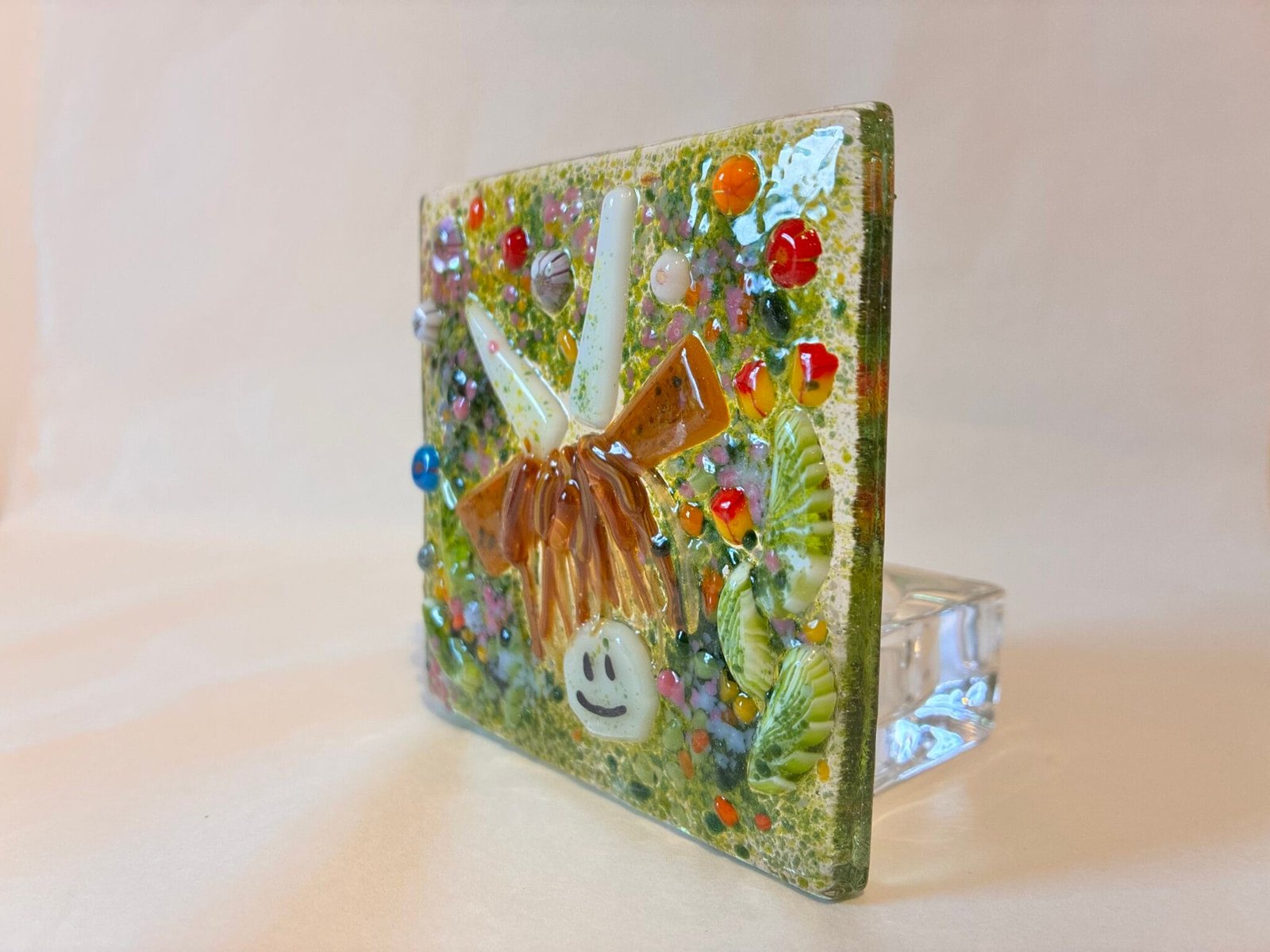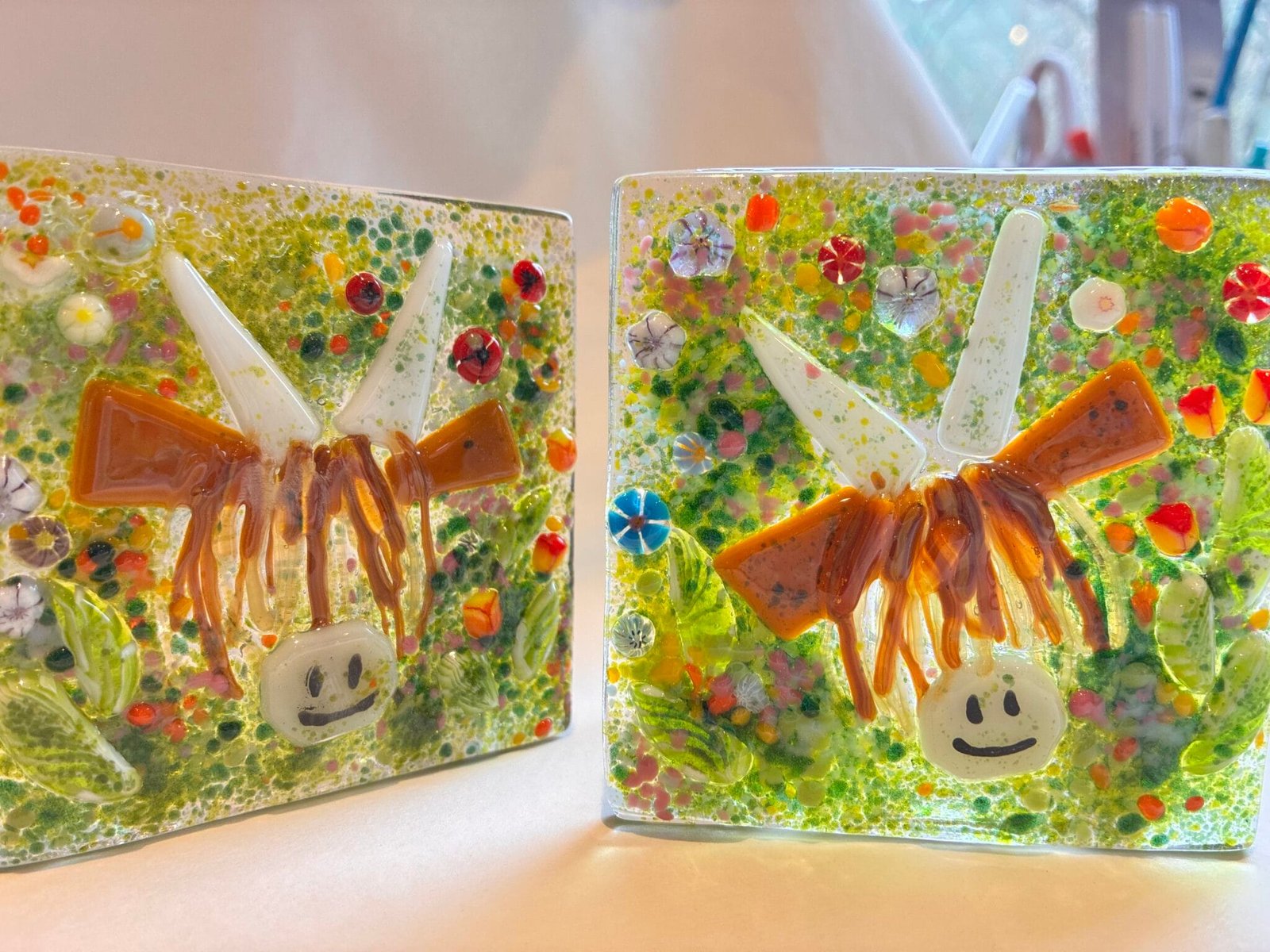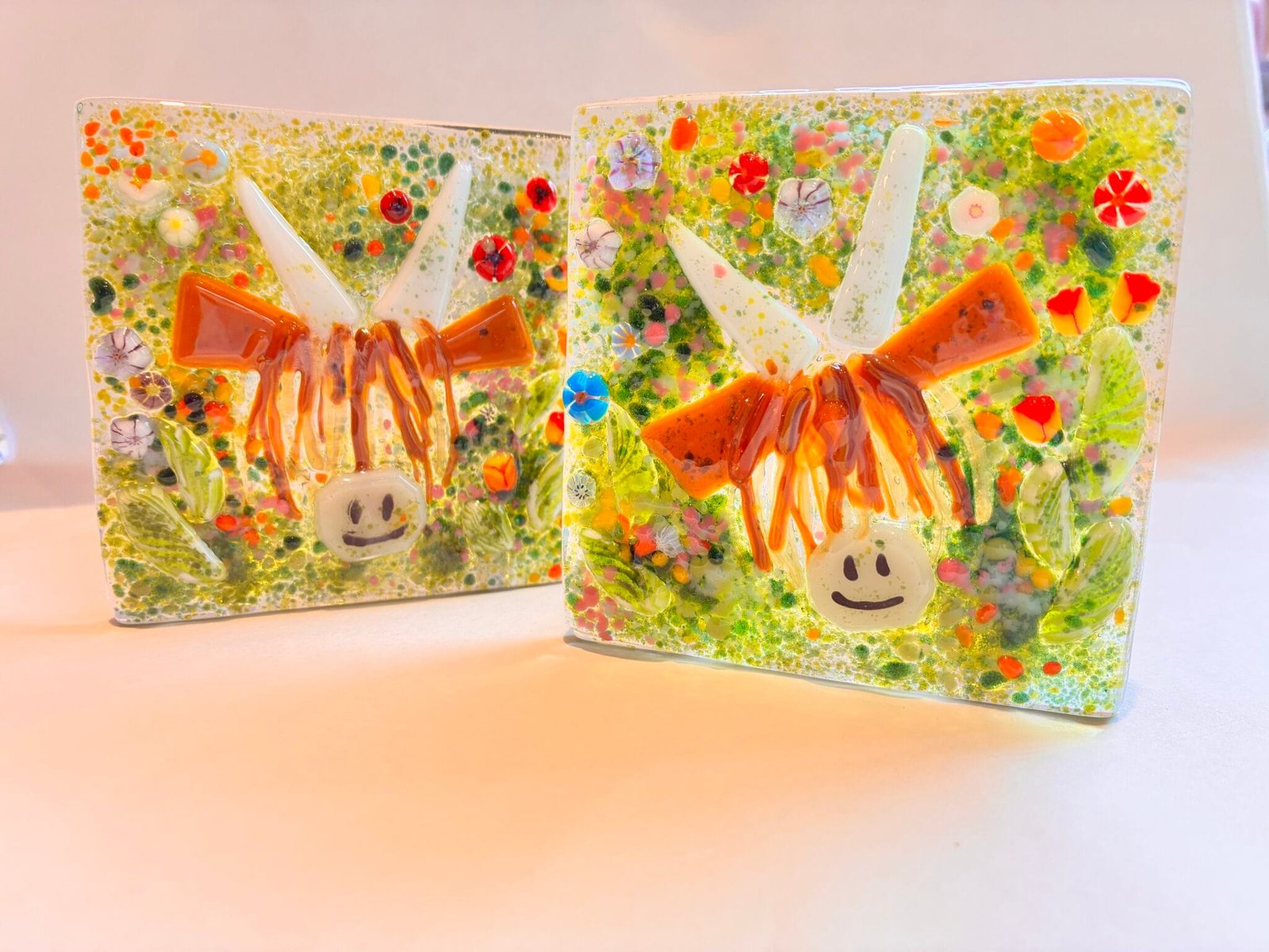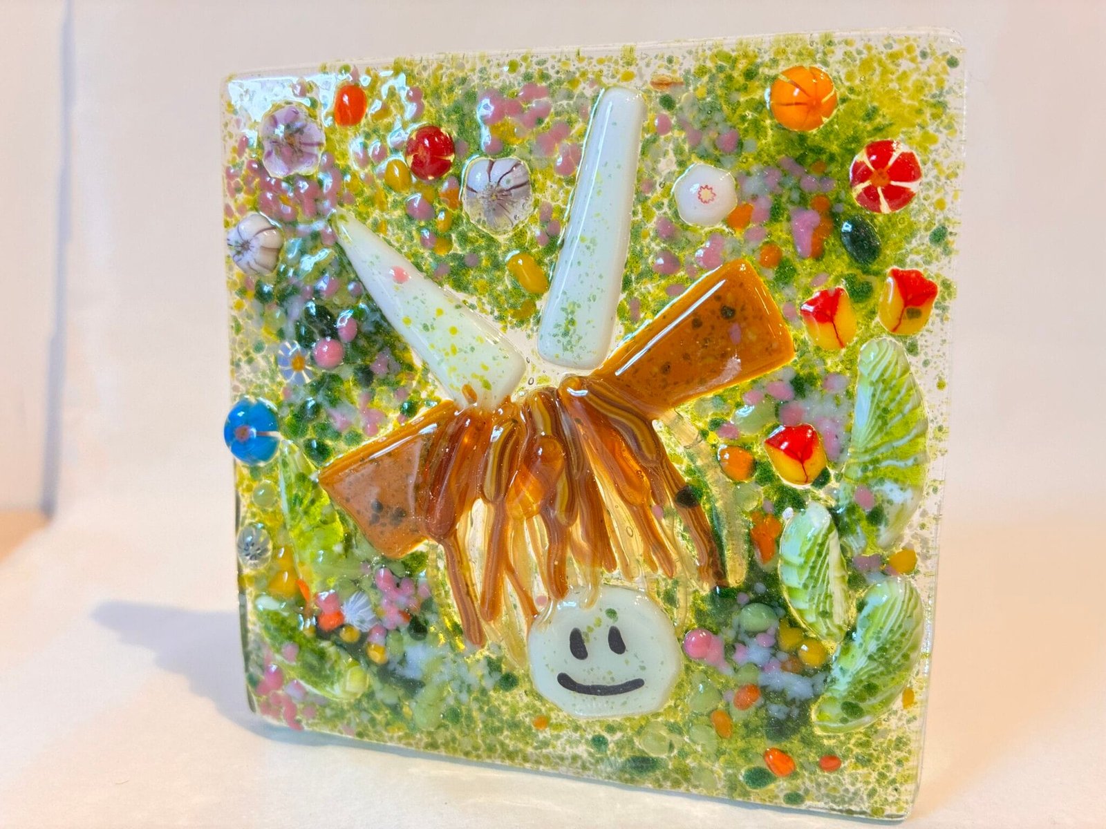 Individually decorated glass pieces kiln fired, creating a meadow scene with a Highland Cow.