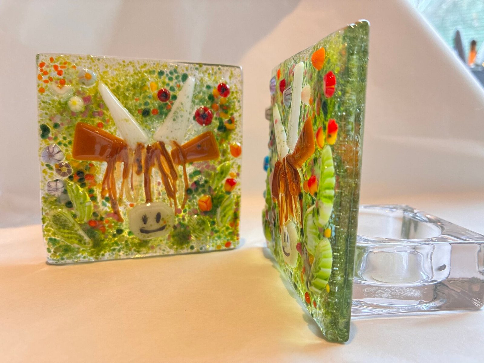 Fused Glass, candle holder with Highland cow and Meadow Flowers