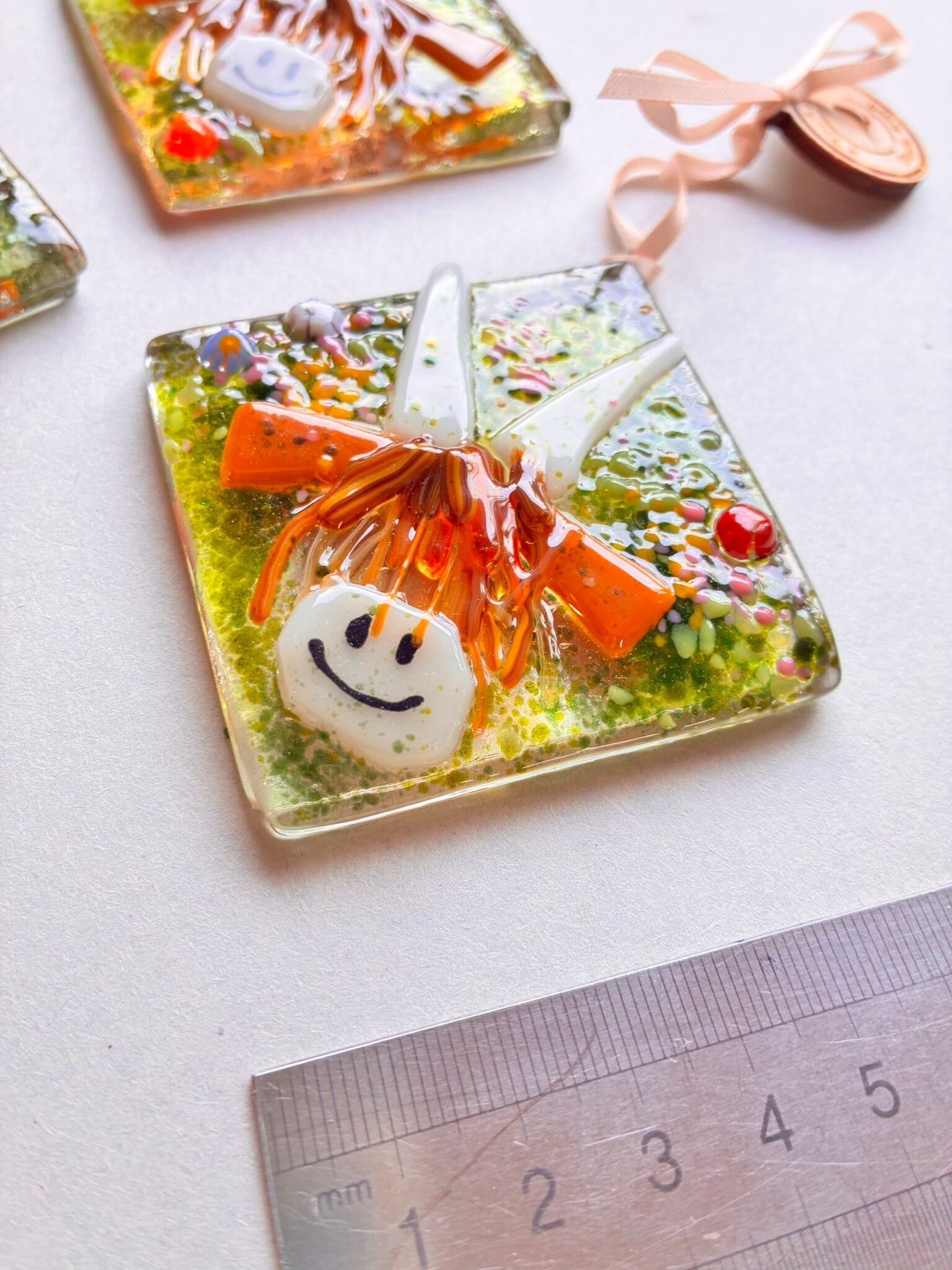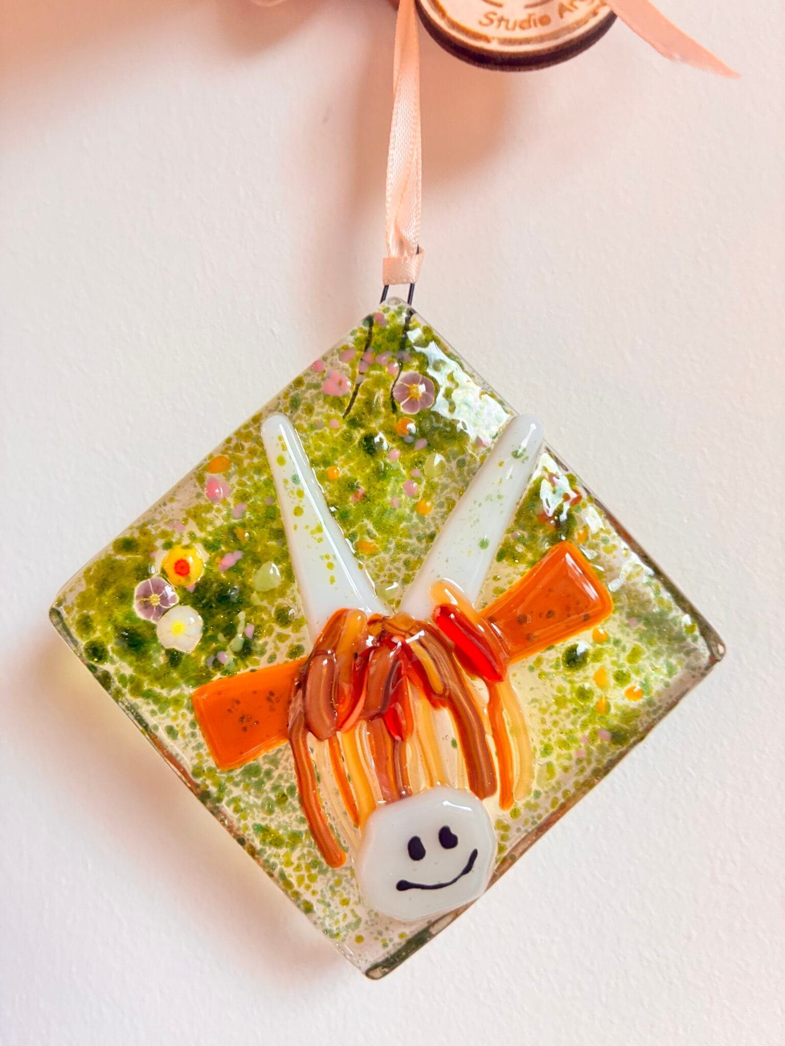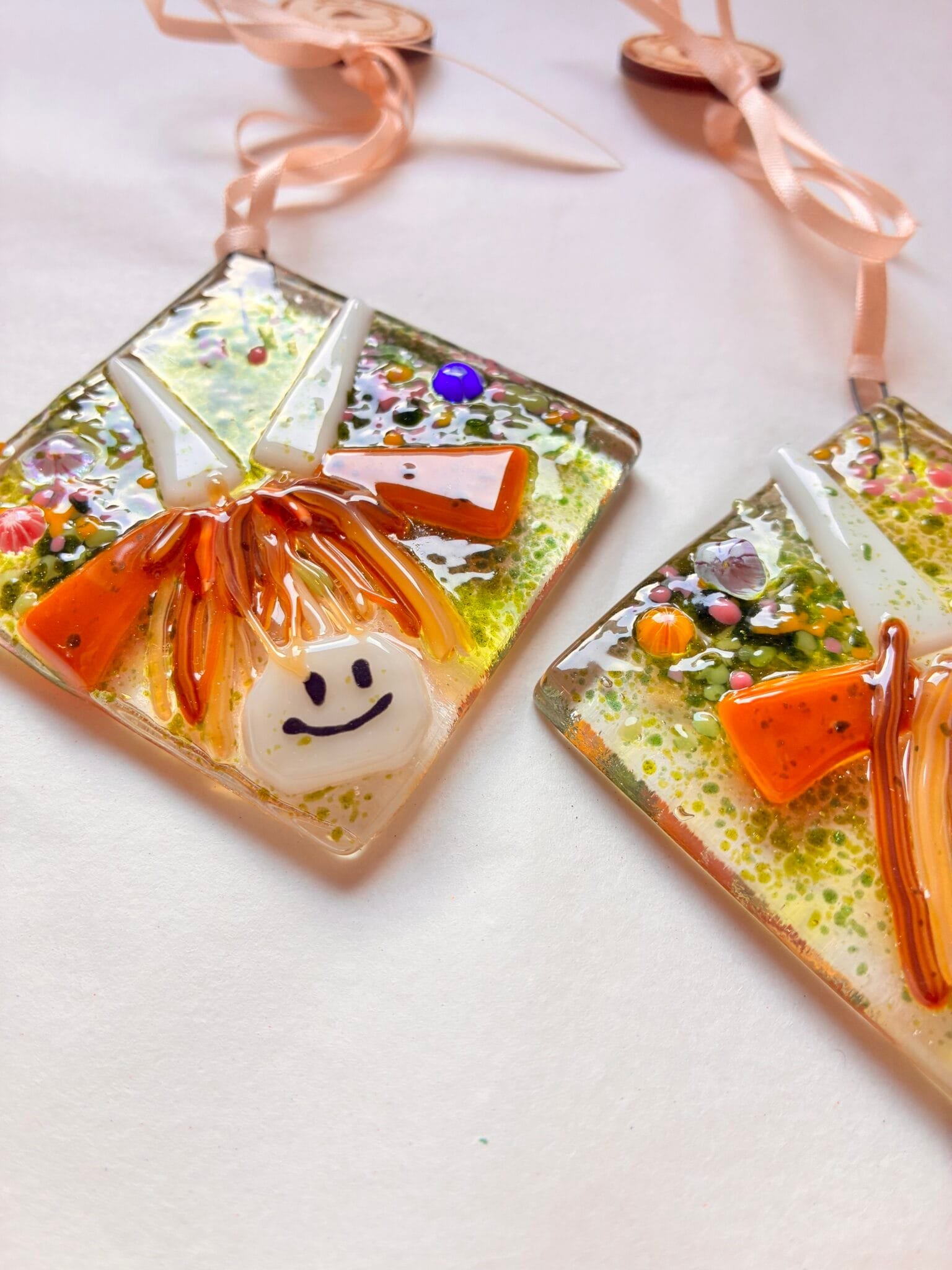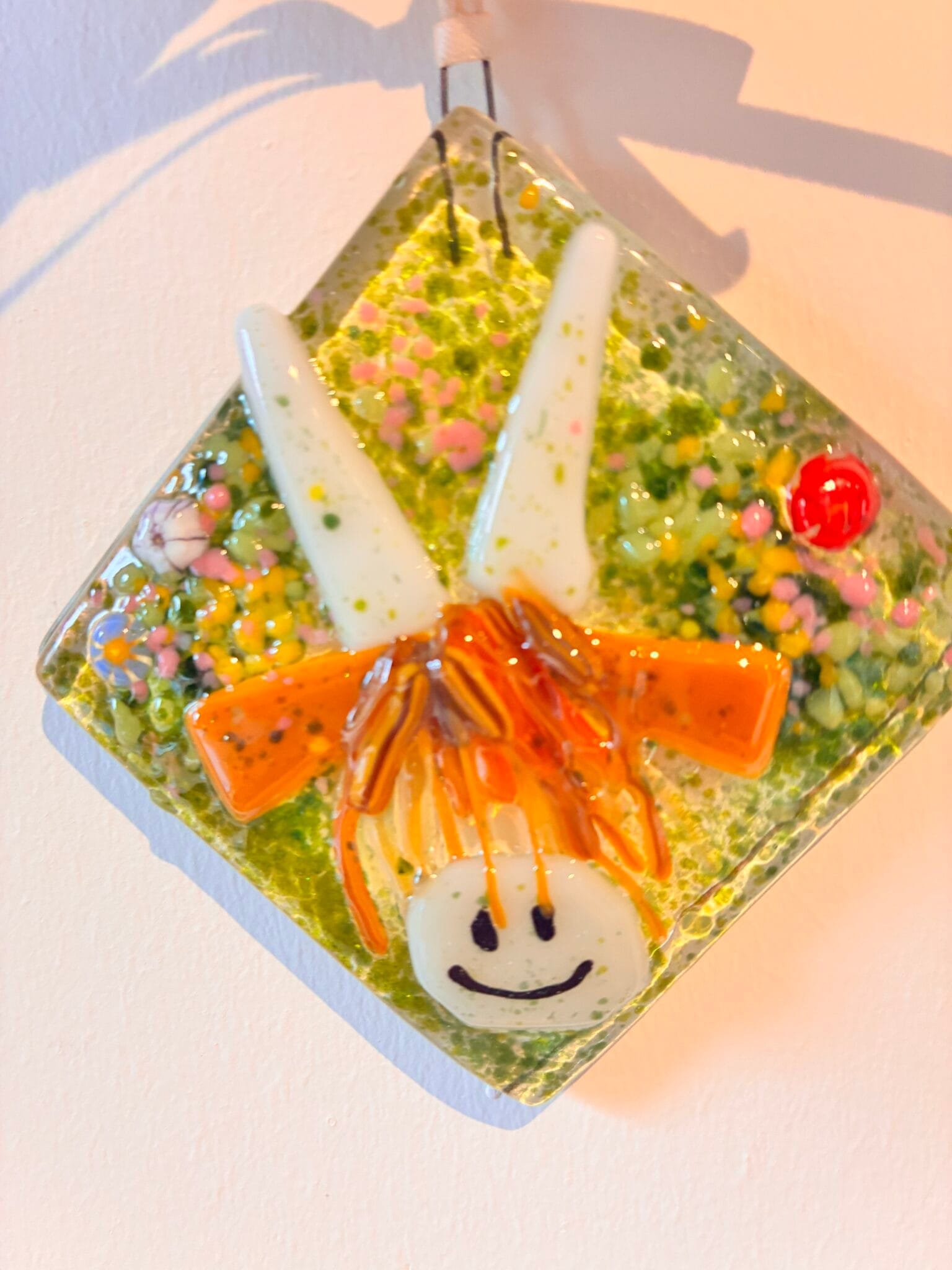 Handmade fused glass window decoration, with painted detail. Creating a fun spring Highland Cow, with his multi tone shaggy coat and iconic horns. Sat in a flower meadow.