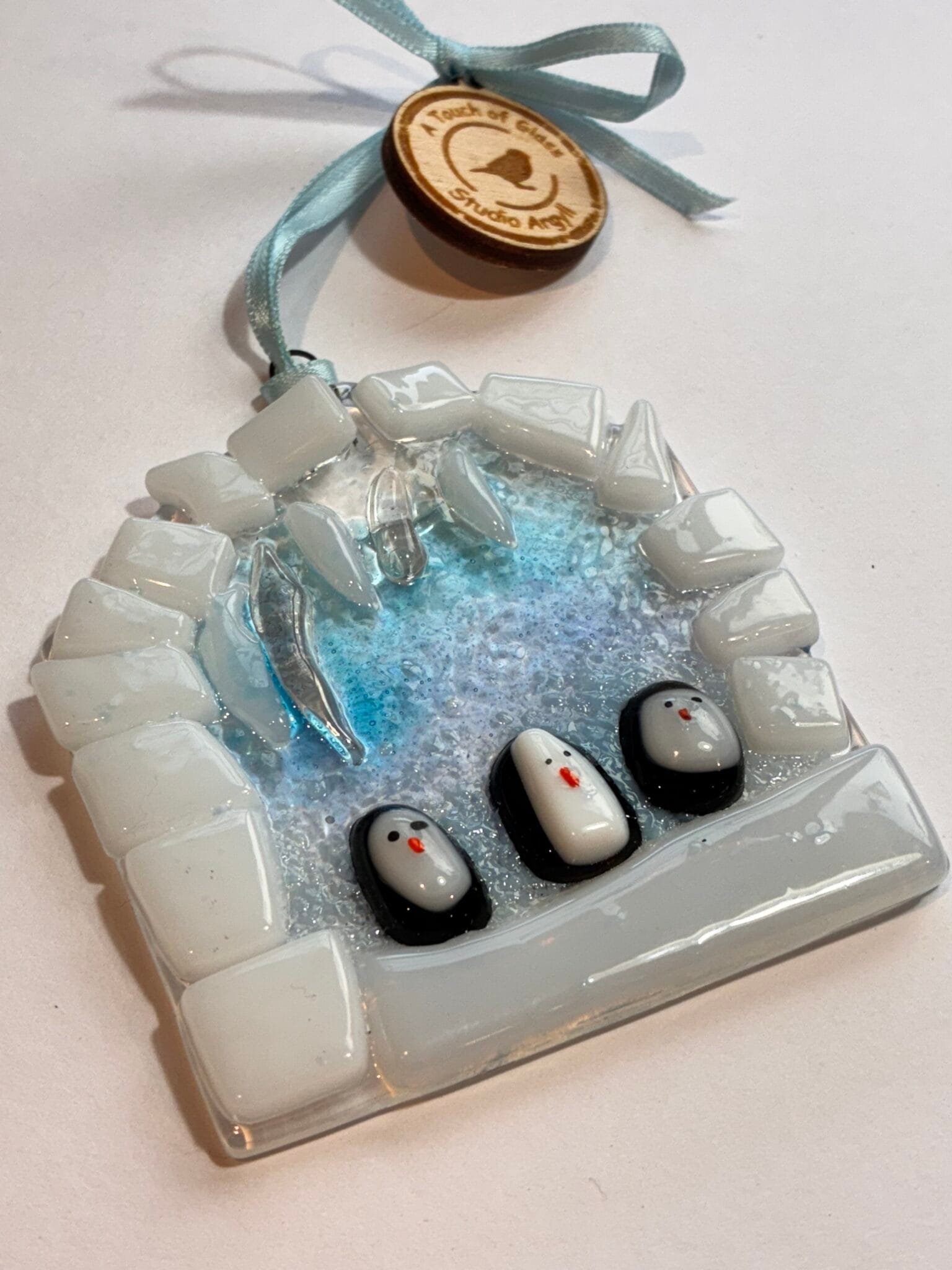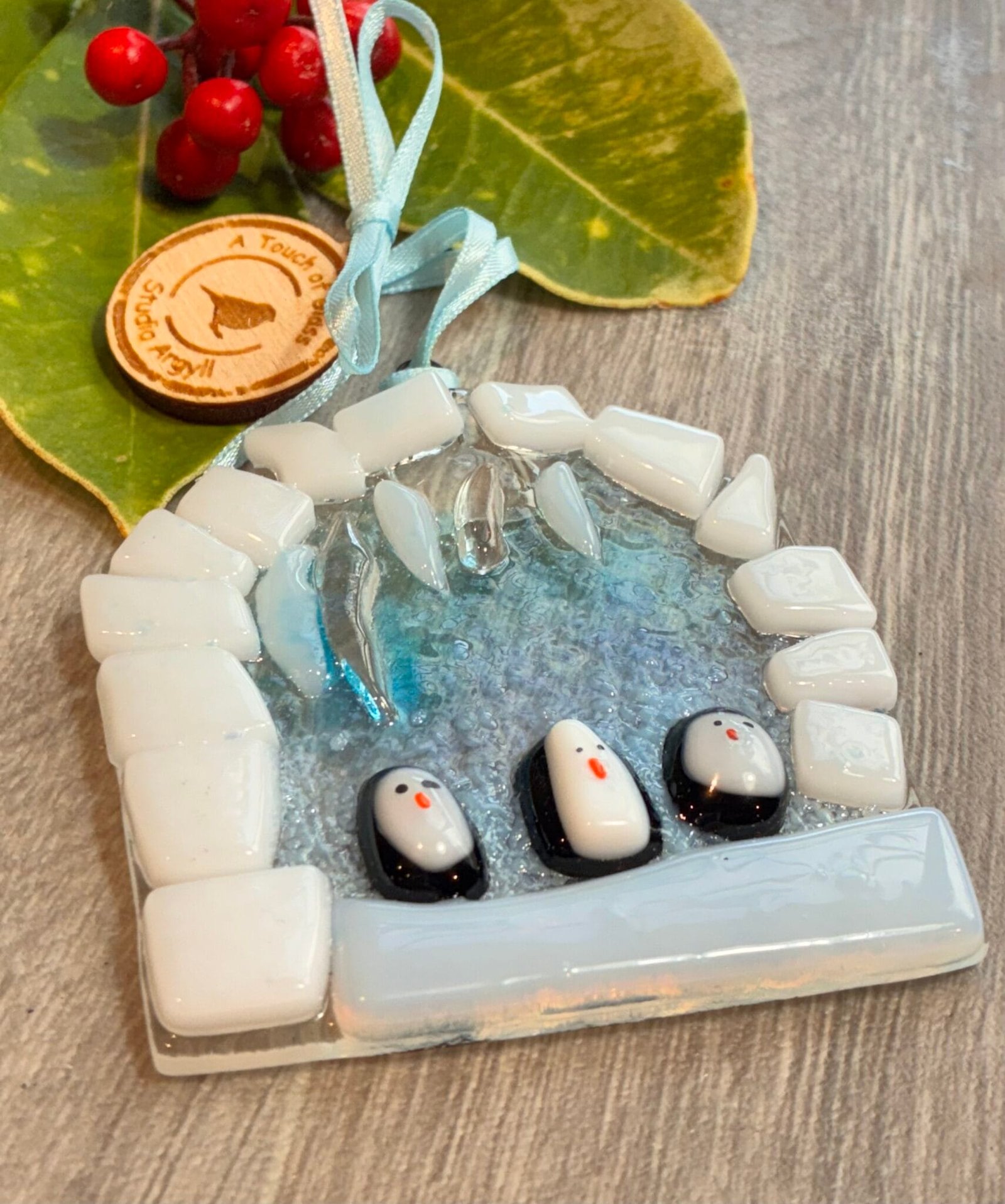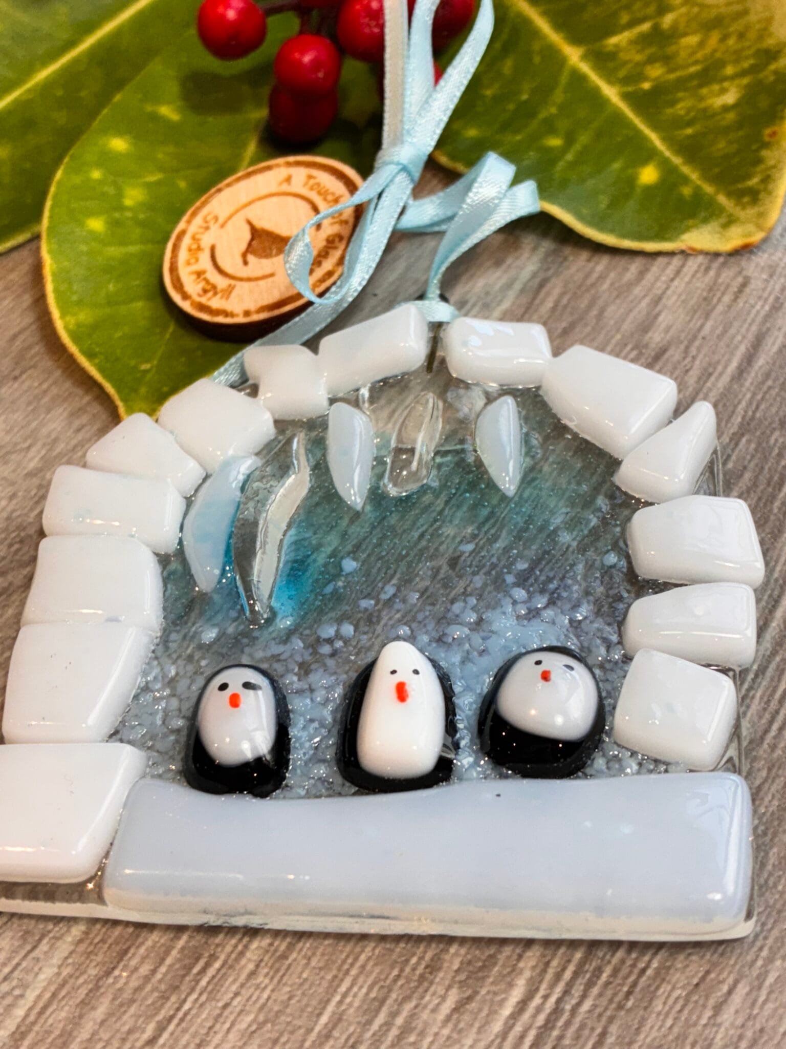 Fused Glass Penguins in Igloo Decoration, Christmas Ornament